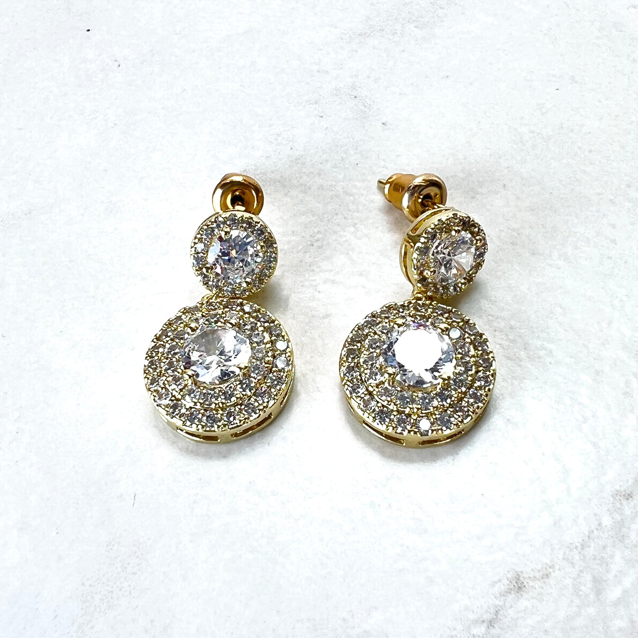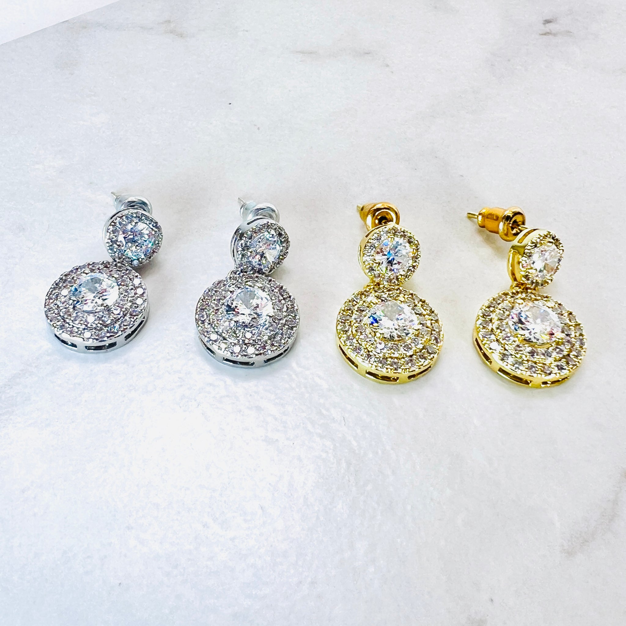 These are real showstoppers- two stones, the larger bottom stone has a double diamanté pavé surround. Available in Emerald Green, Silver and Gold